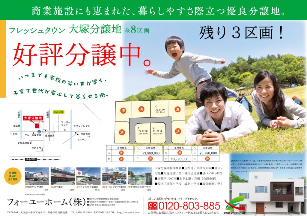 買い物便利・学校近く・自然も豊かな大分県中津市大塚の分譲地。全8区画の人気エリアが残り3区画に。家族が安心して暮らせる住まい。